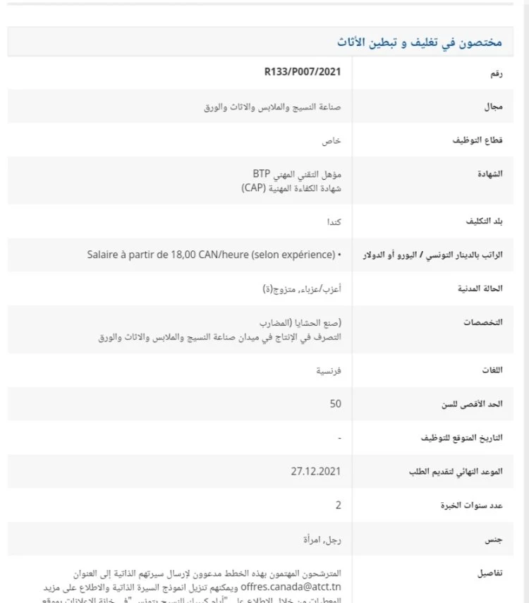 تنظم الوكالة التونسية للتعاون الفني بالتعاون (ATCT) مع وزارة الهجرة بحكومة الكيبيك (MIFI) وشركة التنمية الاقتصادية بدروموندفيل (SDED) أيام كيبيك للنسيج بتونس من 21 إلى 25 فيفري 2022 لتوظيف كفاءات تونسية في مجال النسيج فعلى الراغبين في المشاركة الاطلاع على الوصف الوظيفي للخطط المطلوبة بالدخول على الرابط الخاص بكل وظيفة